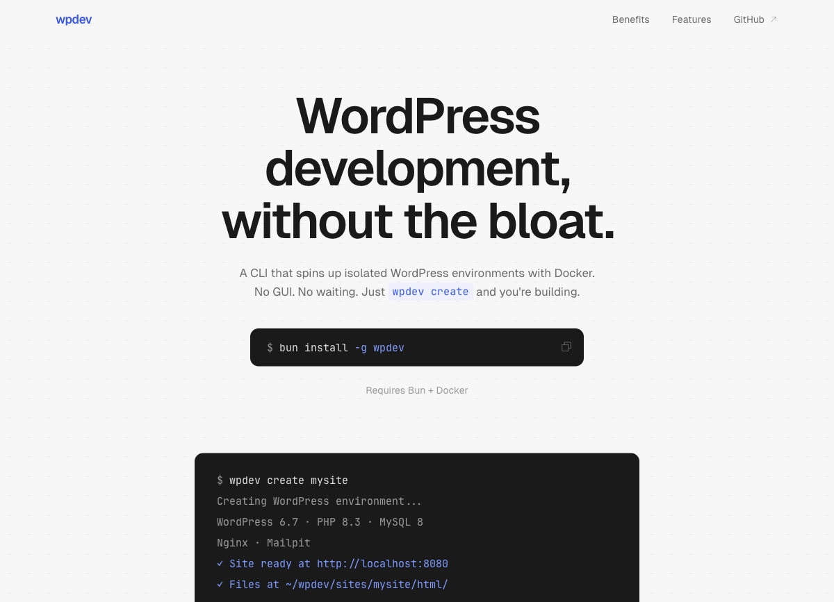 Lokale WordPress-Entwicklung war mühsam. Es gibt Lösungen am Markt, aber was fehlte war eine saubere, lightweight CLI-Umgebung für Entwickler, die gerne im Terminal arbeiten.